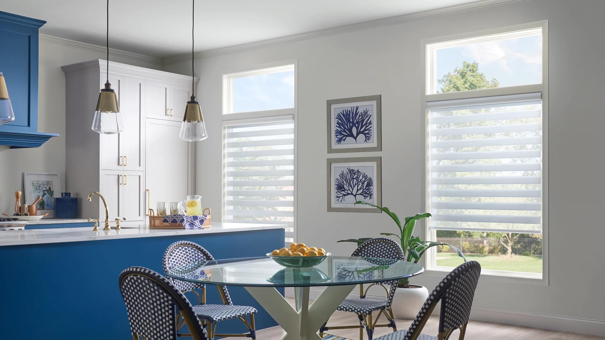 Now comes the fun part! Hopefully, you have thought about these previous questions and have a grasp of the functionality of the window treatments. Whatever your desire is for your kitchen style, Alta is inspired to help. Maybe you are looking for sleek and modern or colorful yet traditional. Are you thinking coastal or farmhouse? Alta has a wide variety of colors, patterns, textures, and products to choose from, and our specialists are ready to help you with tons of suggestions and helpful hints. At Alta, we want to help create the perfect kitchen window treatments for you and your home. Here are a few initial design potentials that you may want to consider for your kitchen: