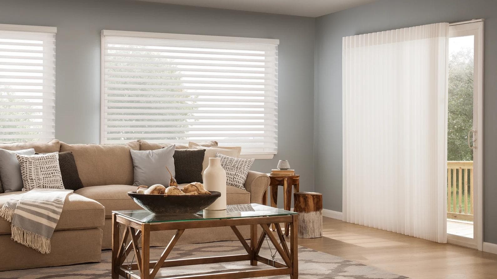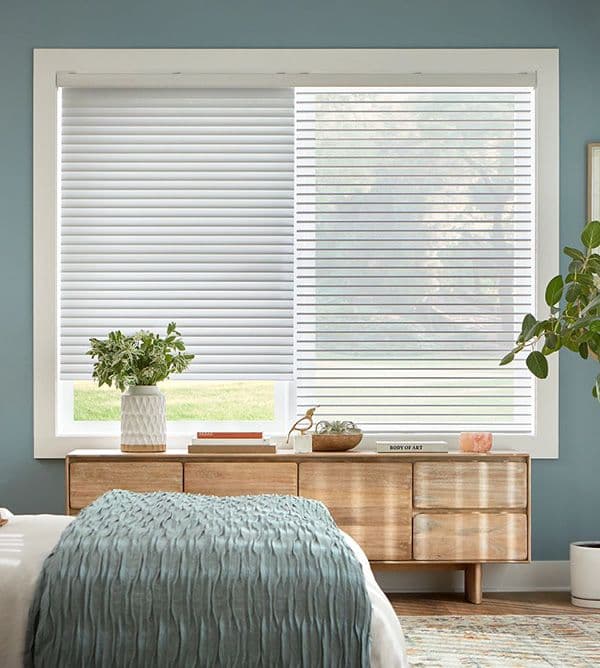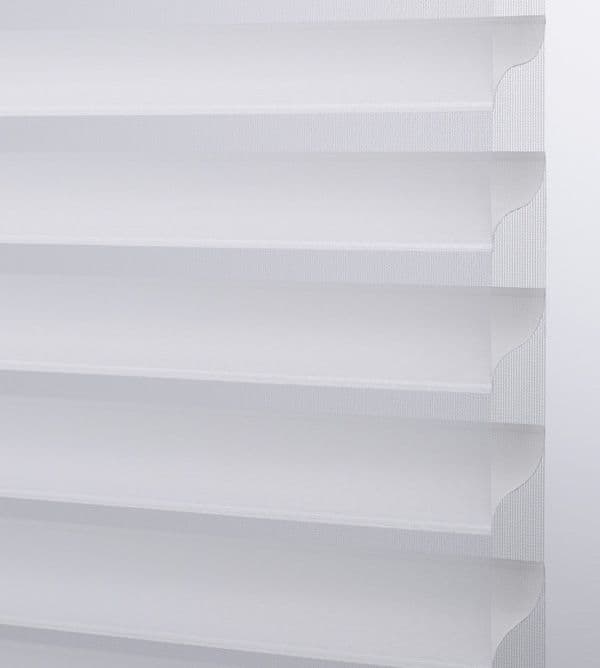 Our Sheer Shadings combine the beauty of a light filtering sheer with the function of a blind for a soft glow that you control. Fabric vanes are suspended between two sheer panels for nuanced brightness. During the day, tilt the vanes open so you can see out while still enjoying privacy. At night, tilt the vanes closed and voila…privacy assured.