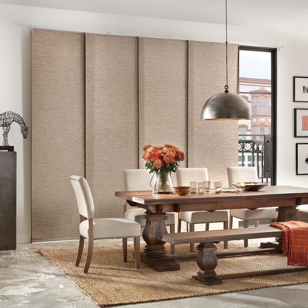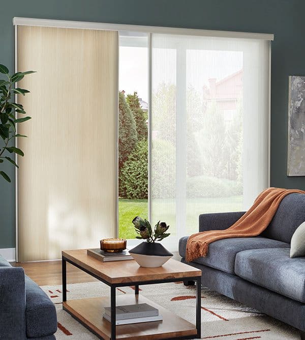 Traditional window shades that operate top to bottom may not be the best fit for sliding doors that open and close side to side. A vertical application is the move — you’ll get privacy and light control without losing access.